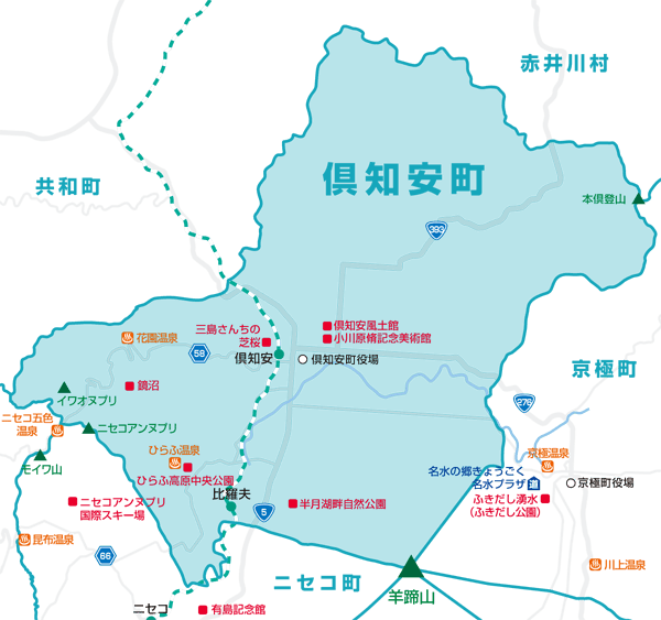 国道230号と道道66号を幹線に豊かな高原の大地が広がり、パラグライダーのメッカ「橇負山」のパノラマテラスからは秀峰羊蹄、ニセコ連峰、洞爺湖、貫気別岳等を眺望できます。