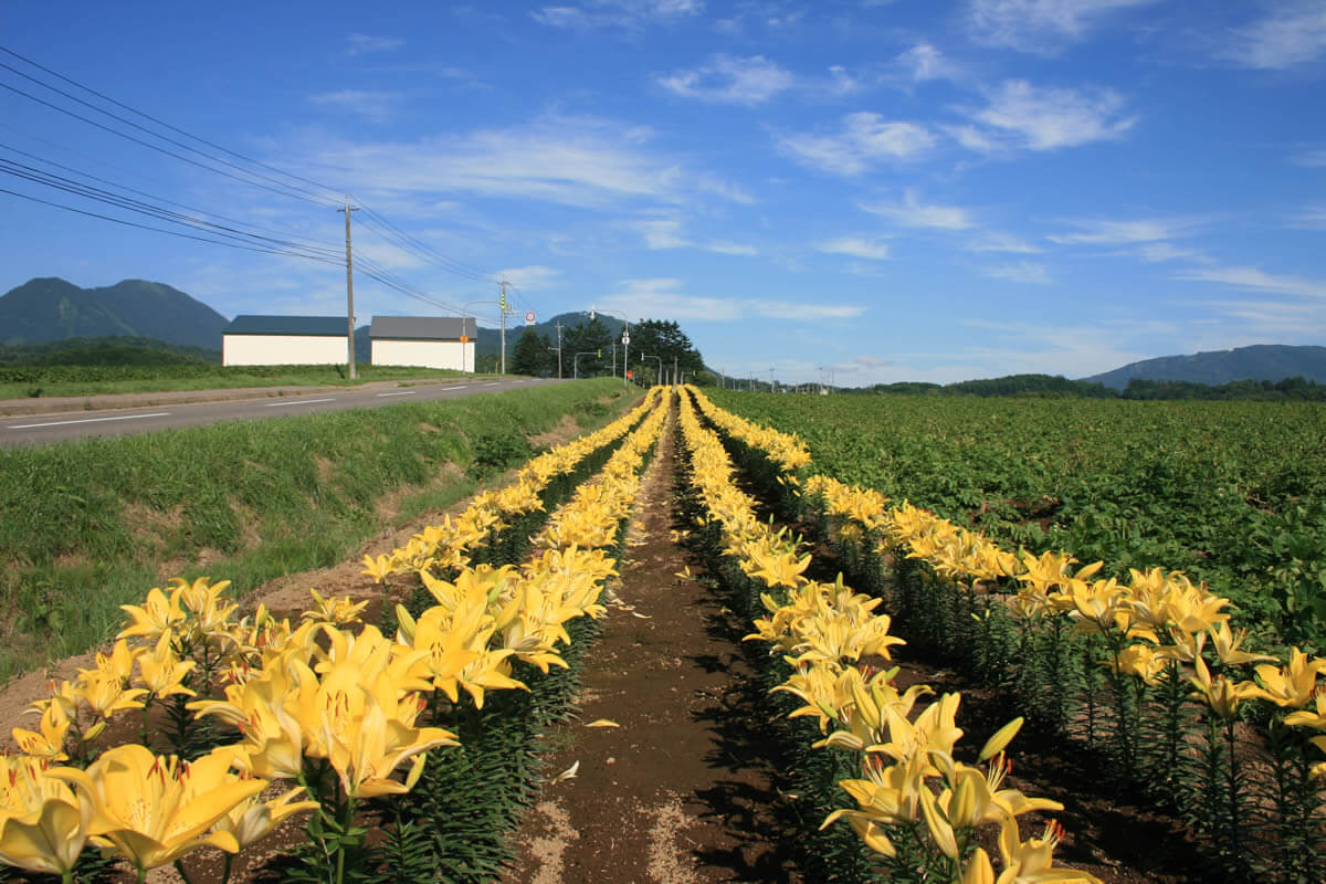 村を訪れる人々を約4万本の黄色い花ユリで歓迎しています。留寿都村境から西へ道道60号線沿いに約2km 続きます。