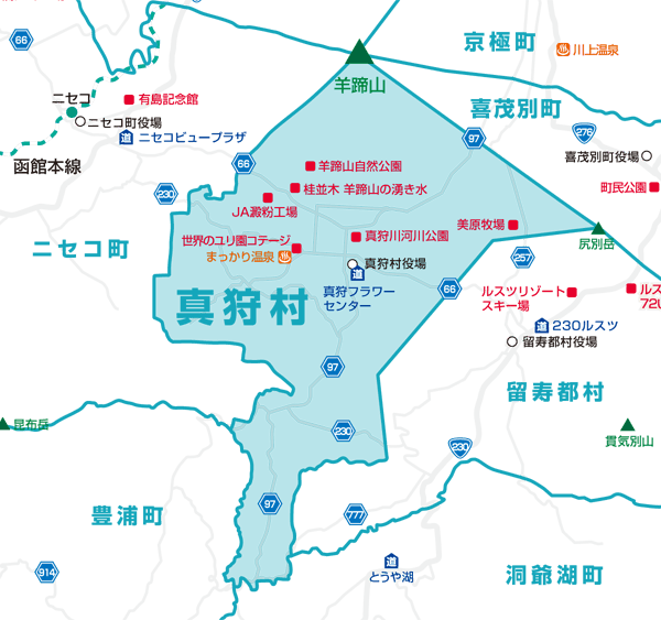 国道230号と道道66号を幹線に豊かな高原の大地が広がり、パラグライダーのメッカ「橇負山」のパノラマテラスからは秀峰羊蹄、ニセコ連峰、洞爺湖、貫気別岳等を眺望できます。